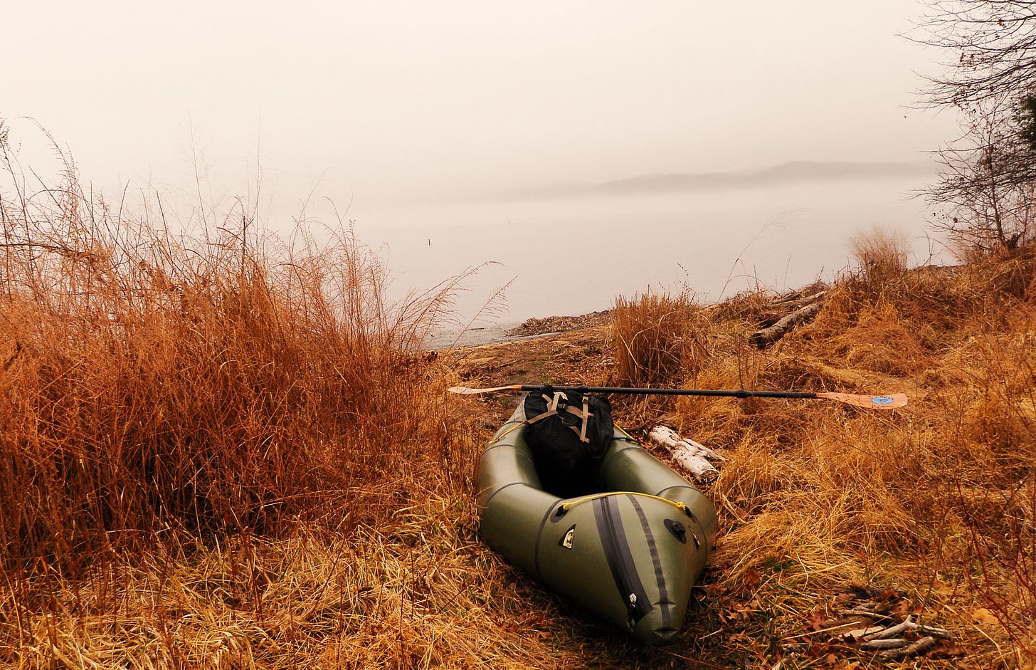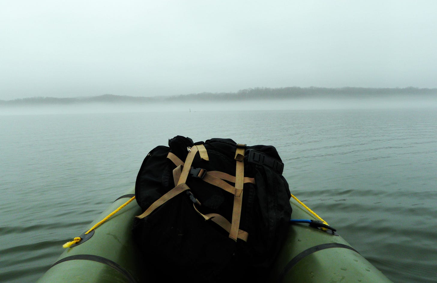 Blowing up the raft with the air bag, I shivered a bit. The official temperature might be about 60, but the cool, wet fog made it feel much colder.